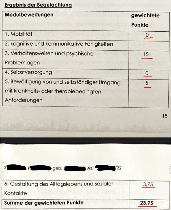 In Modul 4 (dem wichtigsten Modul), vergab Dr. Schuckart nur einen Pflegeeinzelpunkt, was aber trotzdem nur null gewichtete Punkte bedeutet. Obwohl Dr. Schuckart behauptete, die umfangreiche Akte “studiert” zu haben und ein “absolut neutraler Gutachter” zu sein, war er nicht in der Lage, in der rund 1000-seitigen Akte einen weiteren Pflegeeinzelpunkt zu finden.