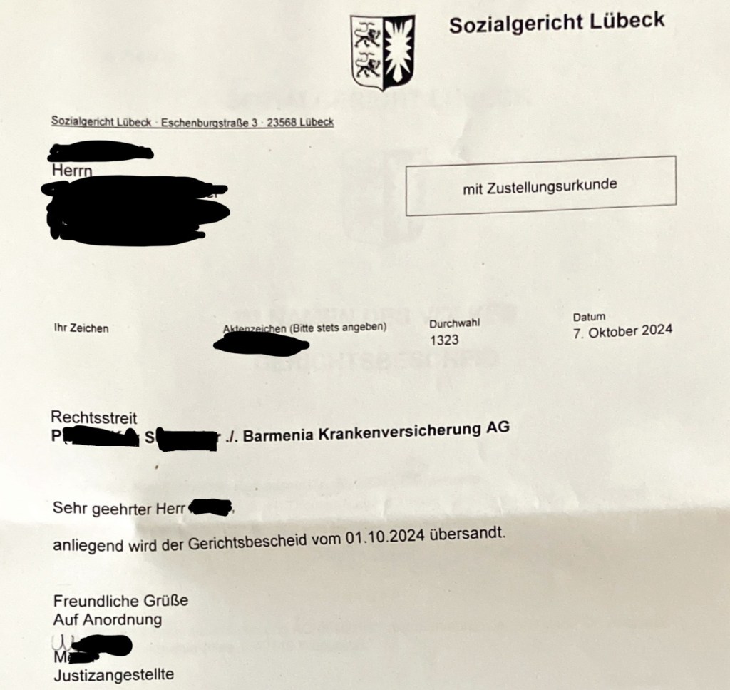 Nun stellt sich die Frage, woher Lutz Köther das Datum 04.10.24 überhaupt kannte? Durfte Köther den Gerichtsbescheid, der seinen Interessen bestmöglich entspricht, etwa vorab zur Korrektur lesen und freigeben, bevor dieser offiziell erlassen und dann mutmaßlich auf den 01.10.24 zurückdatiert wurde? Laut dem offiziellen Anschreiben zum Gerichtsbescheid, ist dieser vom 01.10.24. Bittet Dr. Evers die Gegenseite etwa vor jeder richterlichen Entscheidung untertänig um Erlaubnis und Freigabe? Hat Barmenia Anwalt Köther so vom Datum 04.10.24 erfahren? Wer ist der wahre Vorsitzende der 30. Kammer?